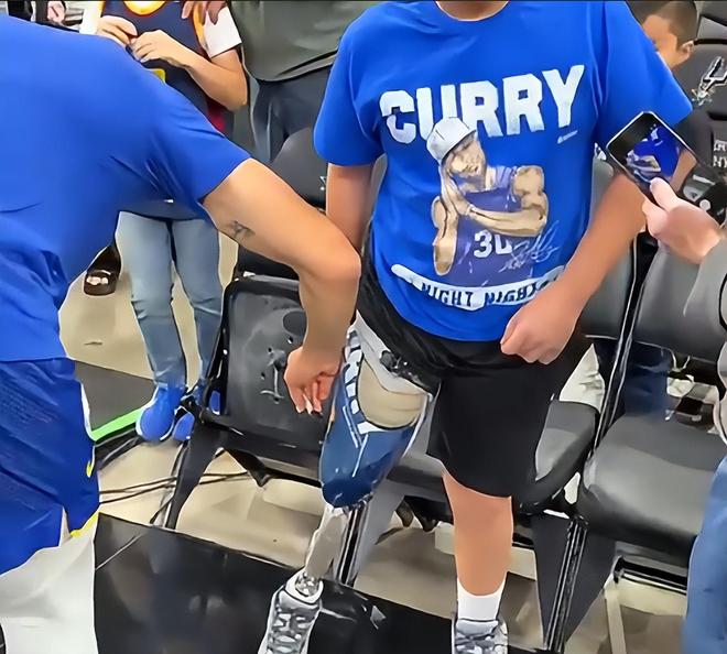 原来小男孩是库里的忠实粉丝,在失去右腿后,他把库里标志性的庆祝手势“night night”印在了自己的假肢上,鼓励自己坚持下去。